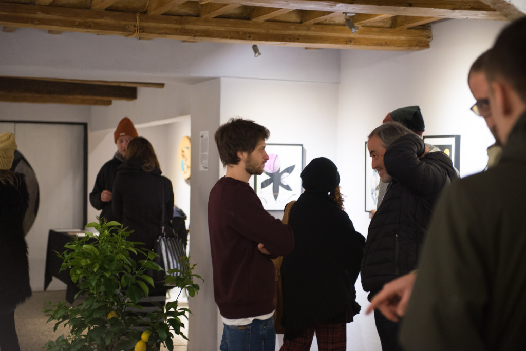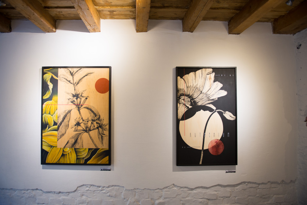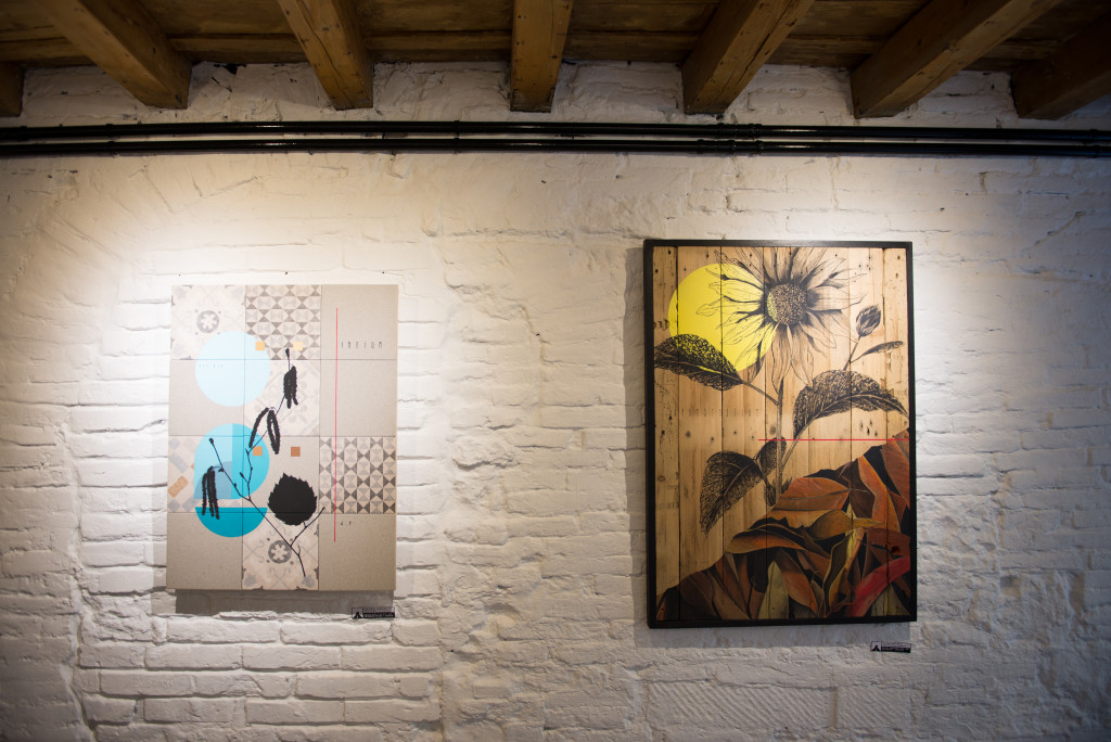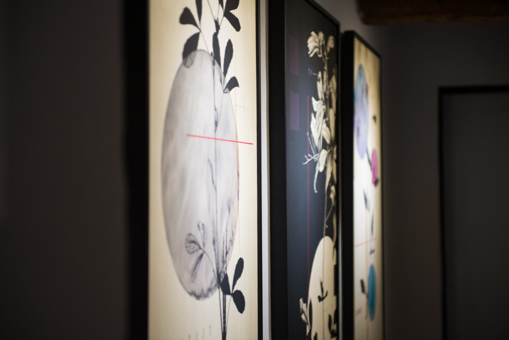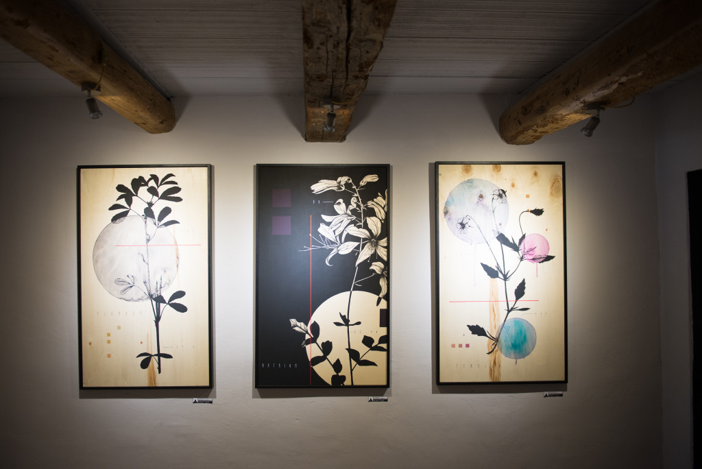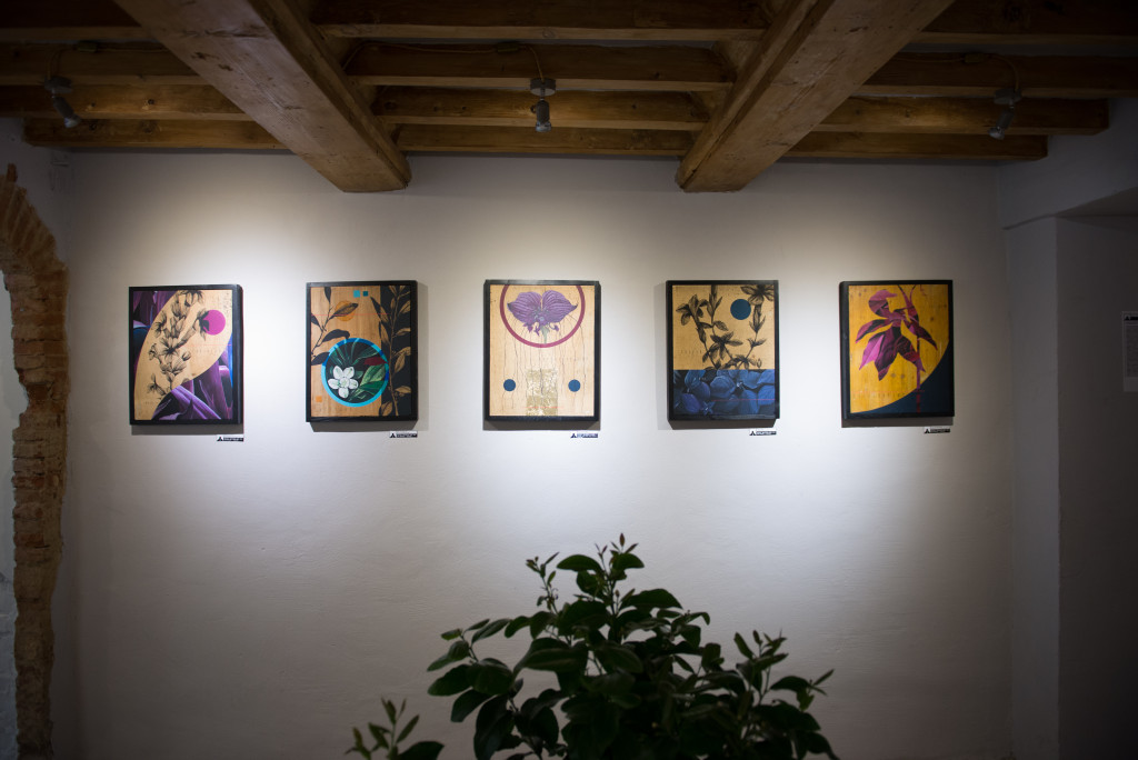 Vorrei iniziare spendendo due parole sulla mostra: la Spagyria è una branca dell’alchimia che si occupa della parte vegetale, quindi invece di interfacciarsi con le pietre e con i minerali si preoccupa delle miscele alchemiche create con i vegetali. Era una sintesi perfetta per quello che stavo facendo io, cioè creare delle opere che avessero una parte chimica e una parte botanica. Da ciò nasce il titolo. Questa mostra è anche un po’ il culmine di un percorso o progetto che comprende tutti gli elementi e che finirà con l’esaurimento della tavola periodica. Diciamo che ho quasi finito gli elementi chimici, ne mancano giusto un paio quindi… Questa è quindi l’ultima mostra che presenterà gli elementi chimici “semplici”, primari. È un po’ il focus della mostra, che chiude il cerchio: nell’esposizione potete vedere dello opere un po’ più vecchiotte e altre ultimate qualche giorno fa, quindi c’è anche una sorta di percorso stilistico che si può notare tra le varie opere.
